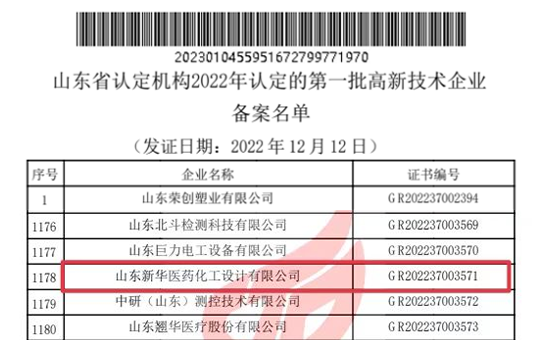 近日,山東省科技廳公布了山東省2022年認定的第一批高新技術企業進行備案的名單,新華制藥子公司山東新華醫藥化工設計有限公司首次通過認定,被授予高新技術企業稱號,證書編號:GR202237003571。至此,新華制藥已擁有4家高新技術企業。